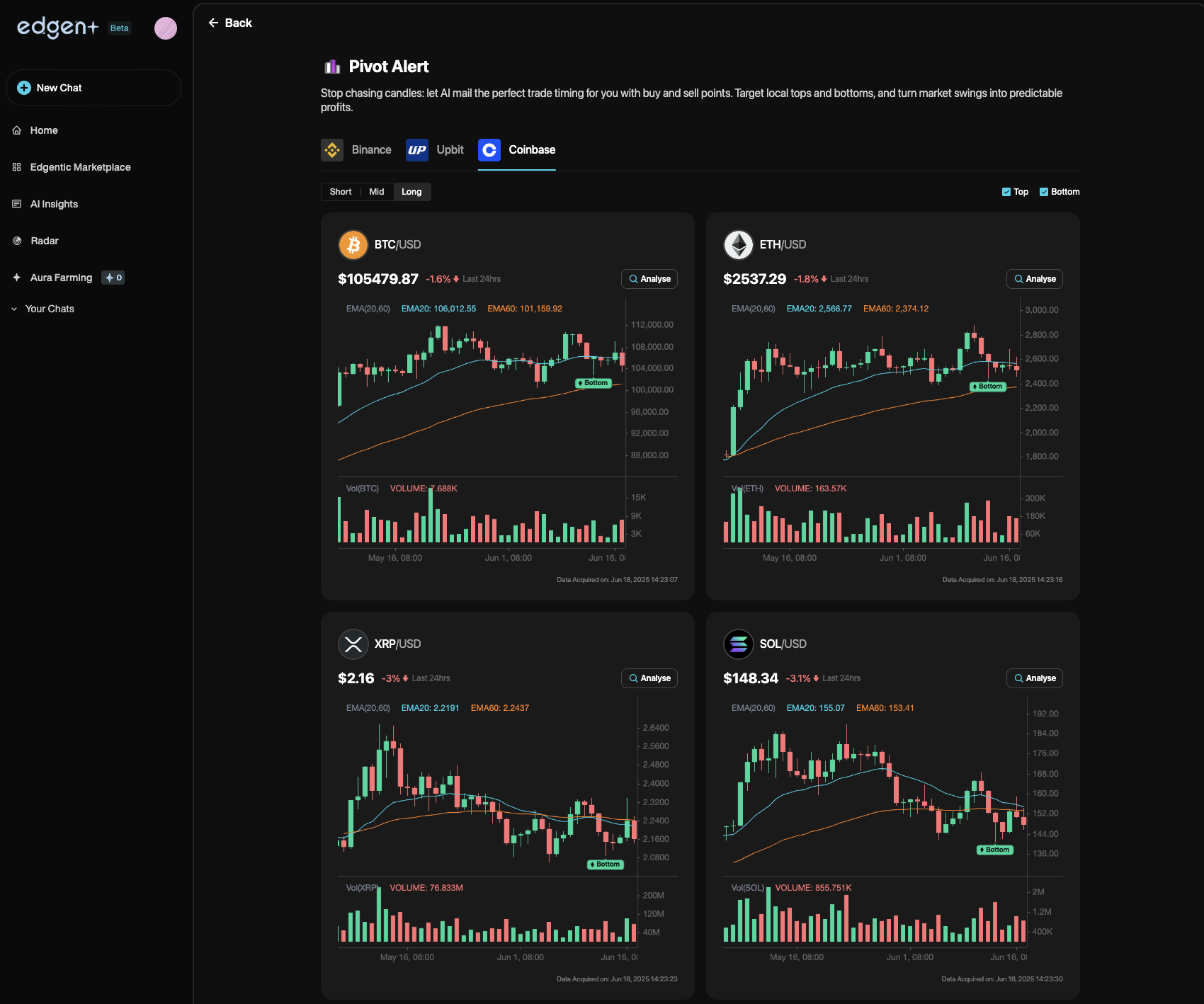 Pivot Alertnhận diện nhanh chóng khi các loại tiền tệ mã hóa đang đến đỉnh hoặc đáy thị trường địa phương, giúp bạn nhận ra ngay lập tức các điểm chuyển biến quan trọng. Tích hợp liền mạch vàoEdgen Search, công cụ mạnh mẽ này rõ ràng cảnh báo cho bạn về các xu hướng đảo chiều tiềm ẩn, giúp bạn đưa ra các quyết định giao dịch thông minh và kịp thời bất kể điều kiện thị trường.