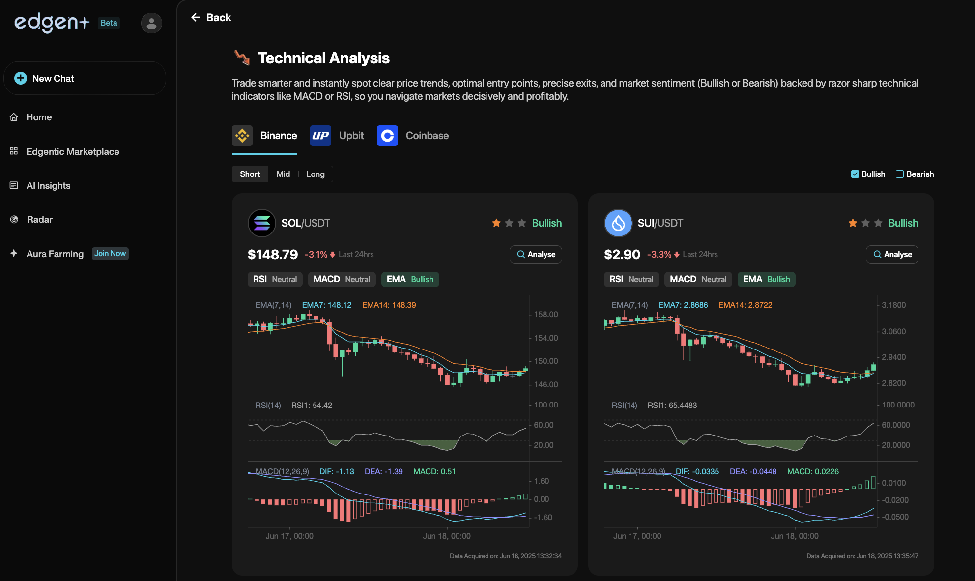 Technical Signals provides immediate technical analysis for any crypto token you trade. Integrated seamlessly with Edgen Search, this powerful tool instantly delivers key indicators such as RSI (Relative Strength Index), MACD (Moving Average Convergence/Divergence), moving averages, and support/resistance levels. Technical Signals makes technical analysis straightforward and practical, helping you quickly evaluate market opportunities and trade with increased confidence.