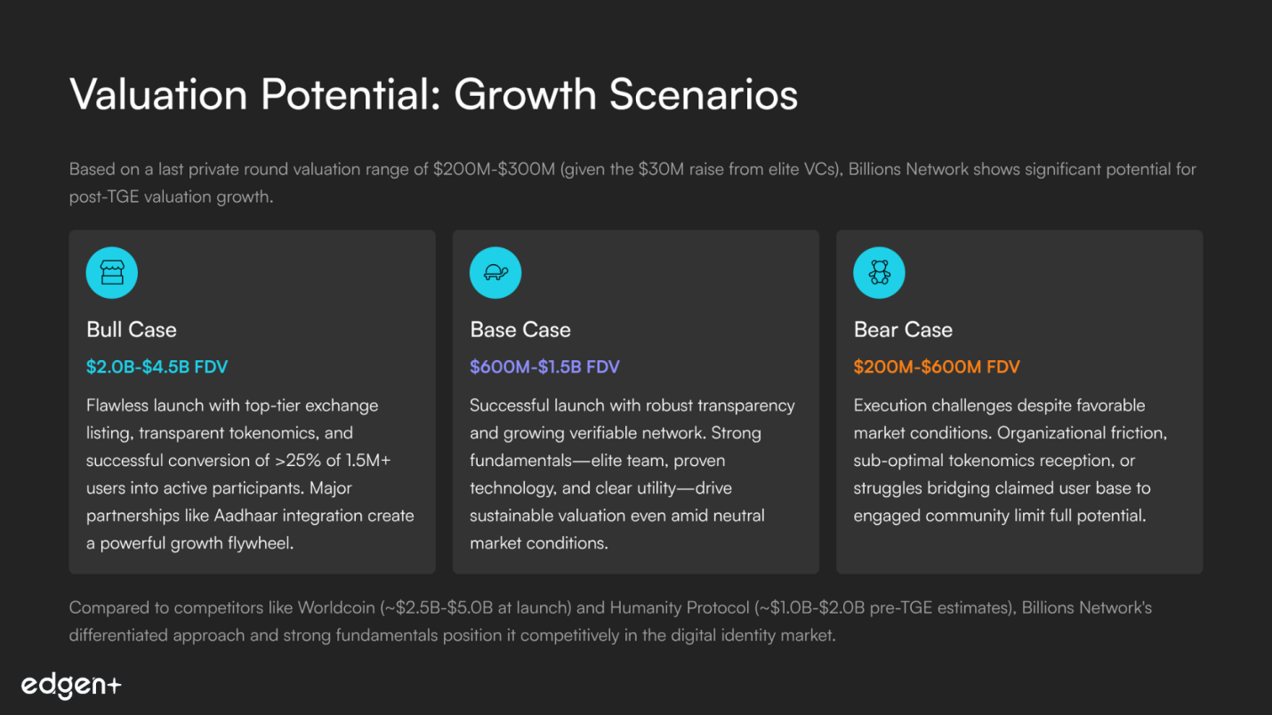 Bull Case | Strong Execution, Favorable Market Conditions | In a flourishing market with a strong identity narrative, Billions Network executes a flawless launch. This includes a top-tier exchange listing, immediate transparency on tokenomics and roadmap, and successful conversion of a significant portion (>25%) of its 1.5M+ users into active participants. Tangible progress on major partnerships like Aadhaar integration creates a powerful flywheel, positioning Billions Network as the premier privacy-preserving, hardware-agnostic solution and justifying a valuation comparable to top-tier infrastructure projects. | US$2.0 B – $4.5 B |