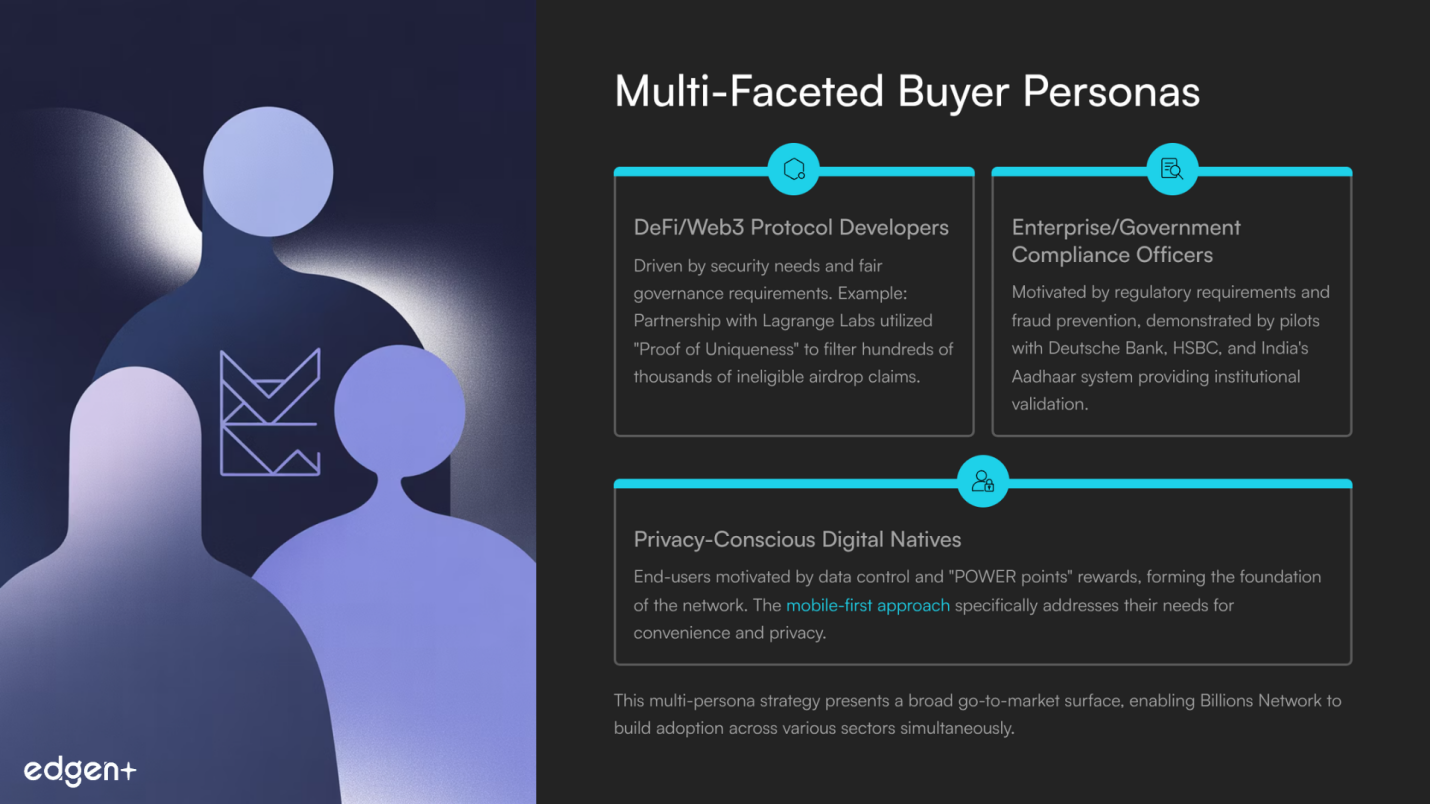 - Enterprise/Government Compliance Officer: Driven by regulatory requirements and fraud prevention, evidenced by pilots with Deutsche Bank, HSBC, and India's Aadhaar system.