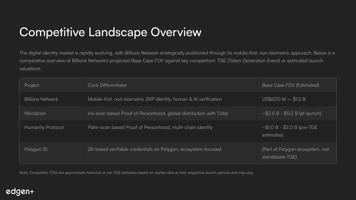 The competitive landscape for digital identity is dynamic, with several projects vying for market leadership. Billions Network's differentiated mobile-first, non-biometric approach positions it uniquely. Below is a comparative overview of Billions Network's projected Base Case FDV against some notable competitors' TGE (Token Generation Event) or approximate launch valuations.