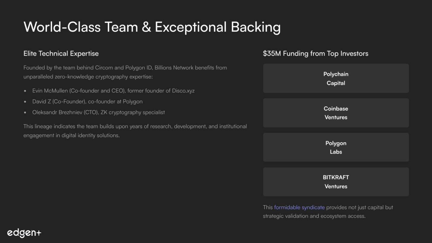 Billions Network's execution credibility is exceptionally strong, anchored by a core team with a proven track record in zero-knowledge cryptography and decentralized identity. The founding team includes Evin McMullen (Co-founder and CEO), David Z (Co-Founder), and Oleksandr Brezhniev (CTO), representing significant leadership strength. Their domain expertise stems from the project's origins as a direct evolution of teams and technology from Privado ID (formerly Polygon ID) and as being "born from the team behind Circom," the open-source ZK programming language used by over 9,000 projects. David Z's co-founder role at Polygon provides immense crypto-native credibility. Evin McMullen's experience as founder of Disco.xyz further demonstrates relevant execution. This lineage indicates the team builds upon years of research, development, and institutional engagement, including prior proof-of-concept tests.