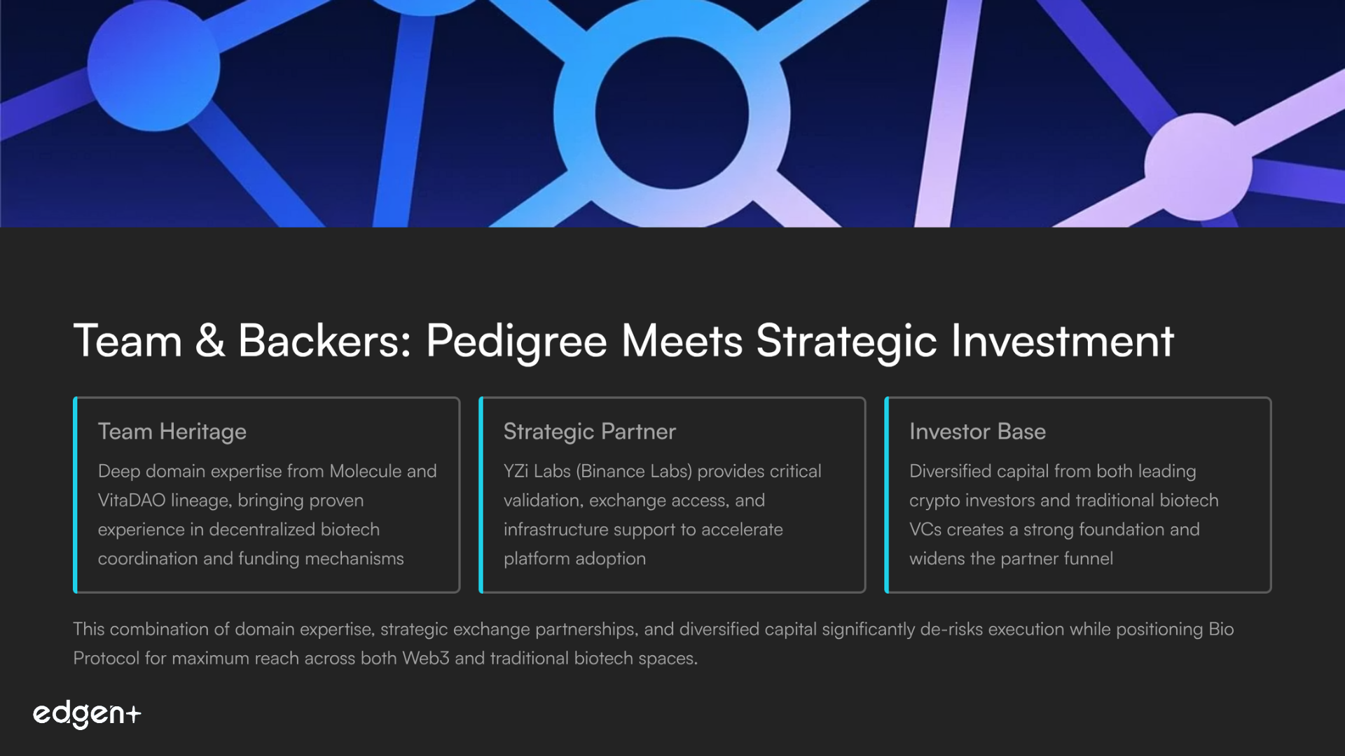 - Team/Backers: Deep domain team (Molecule/VitaDAO pedigree) + YZi Labs (Binance Labs) and top crypto/biotech investors.