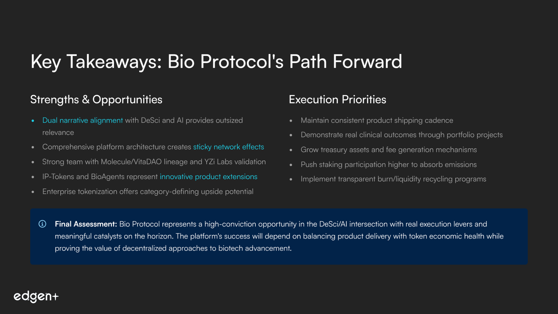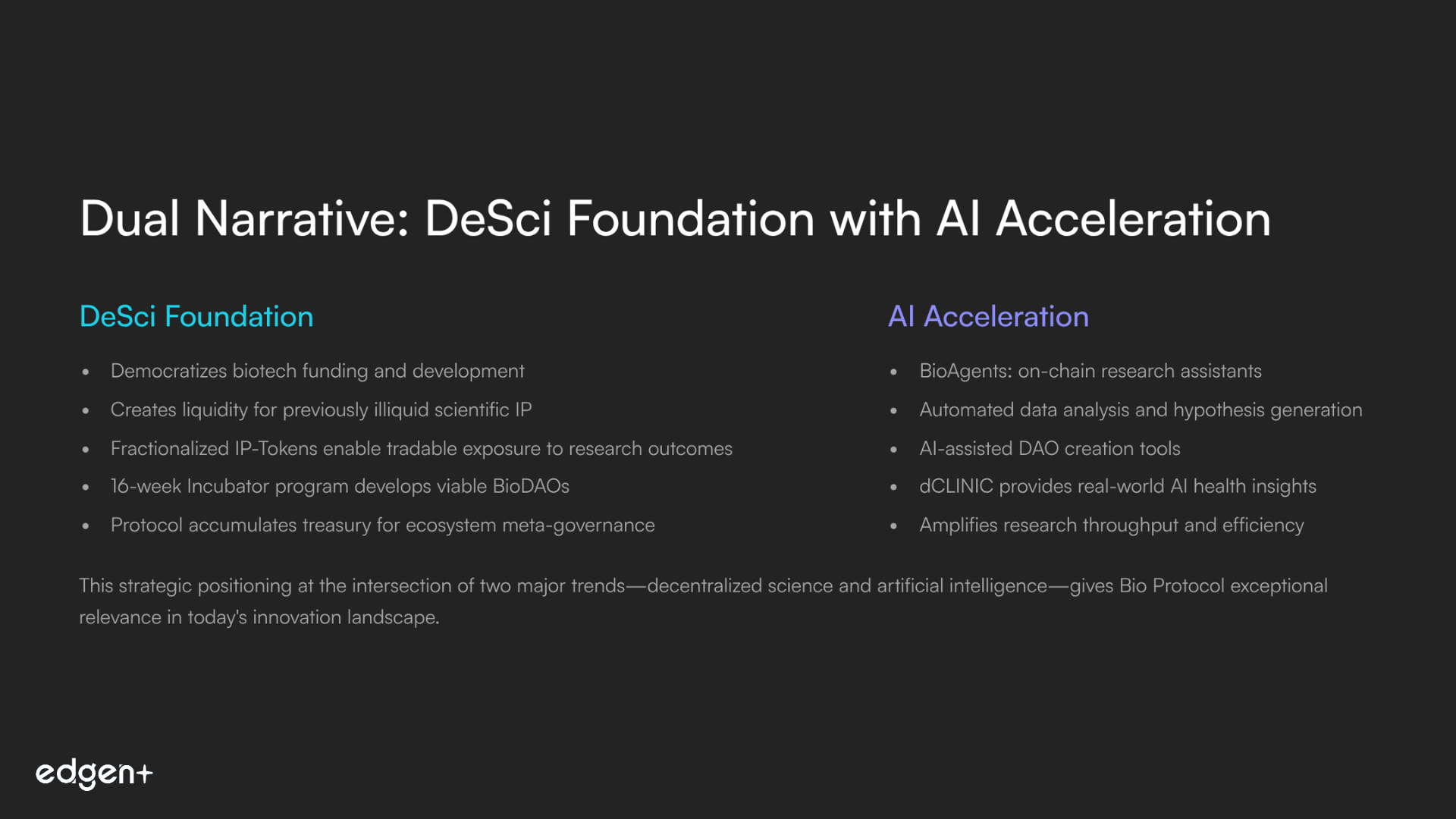 Vision fit. Dual-narrative alignment (DeSci + AI) gives Bio Protocol outsized relevance: it funds and accelerates research while making IP liquid.