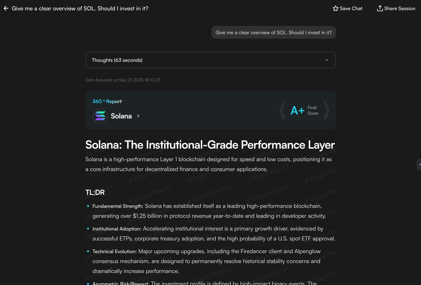 Behind each answer, agents retrieve the relevant layers: filings and earnings, on-chain flows and derivatives, sentiment and curated news. EDGM links them into one narrative. Instead of fragments, the output carries context that traders can act on and engineers can trace.