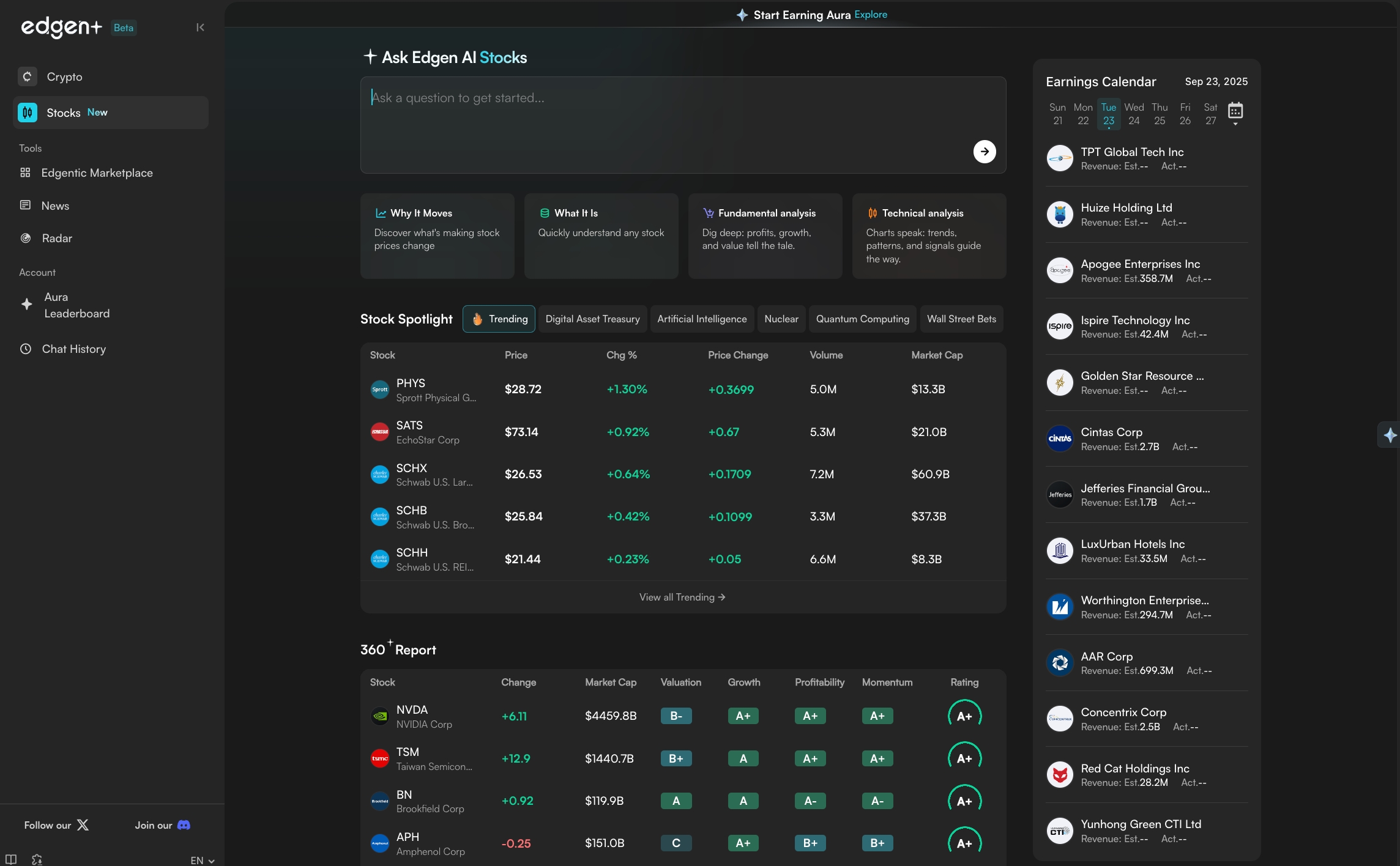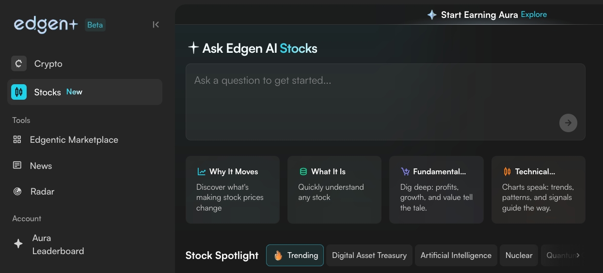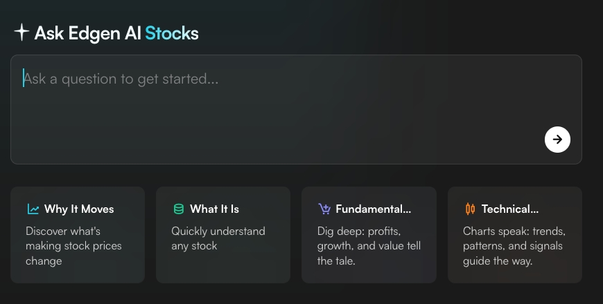 Search is Edgen’s question-and-answer interface to the markets. A user can type a natural question (about a stock, a token, or an investment theme) and receive a structured response in seconds.