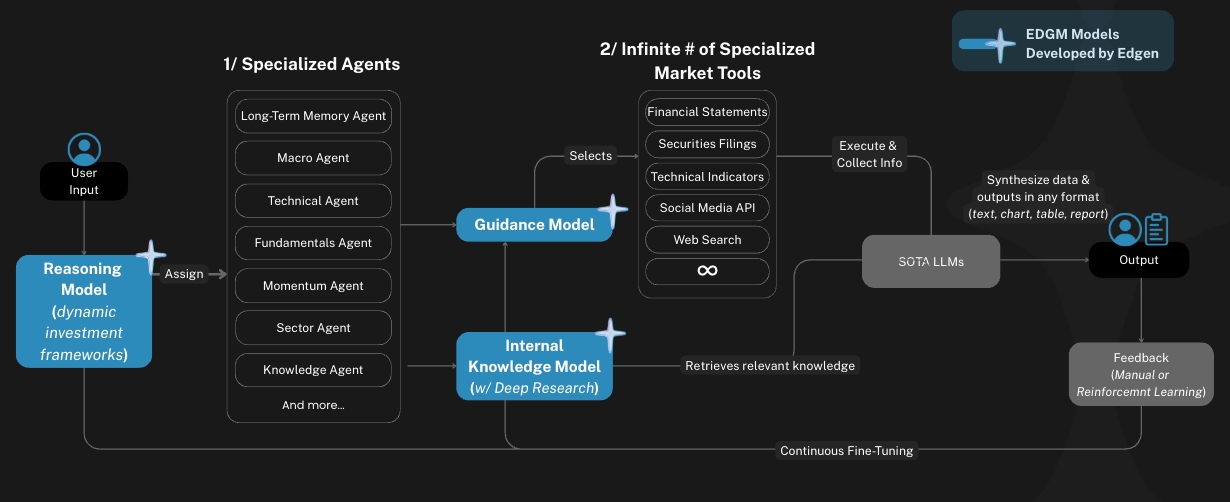 At its core is EDGM (Efficient Decision Guidance Model), a commander model that directs specialist agents. Each agent has a defined task: parsing earnings, monitoring on-chain activity, reading derivatives markets, or mapping narrative drivers.