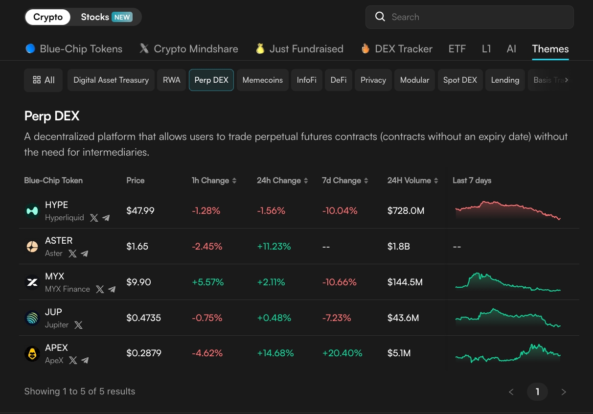 Themes also track how narratives evolve. New sectors appear as they gain relevance, while existing ones update continuously. This gives traders an index-like lens on both markets, built on the same decision model that powers Search.