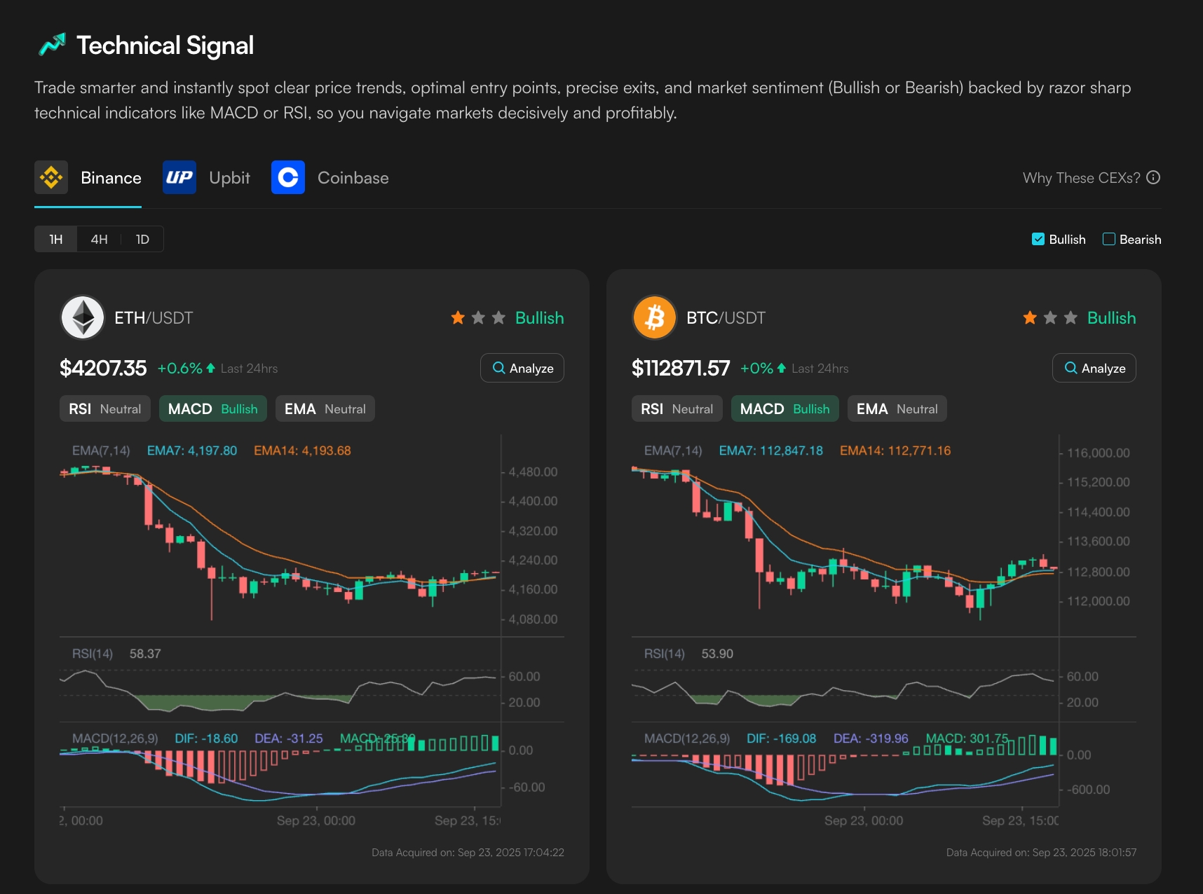 Instead of scrolling through terminals or coding TA formulas, traders see an instant readout of RSI, MACD, EMA, and related metrics. Signals are normalized into clear classes so you can compare assets side by side.