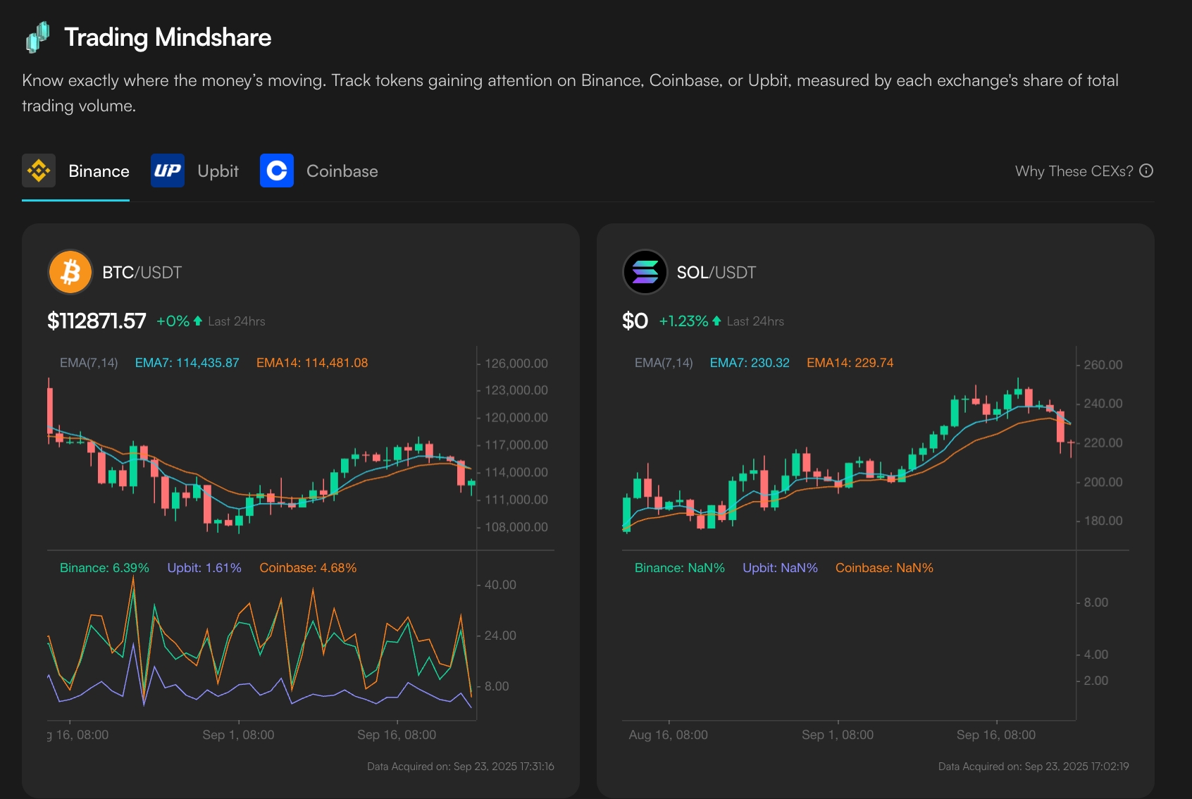 Trading Mindshare shows where liquidity is moving. For each token, you see which exchange (Binance, Coinbase, or Upbit) is driving volume, and whether attention is building or fading. A sudden spike on one venue signals where traders are clustering.