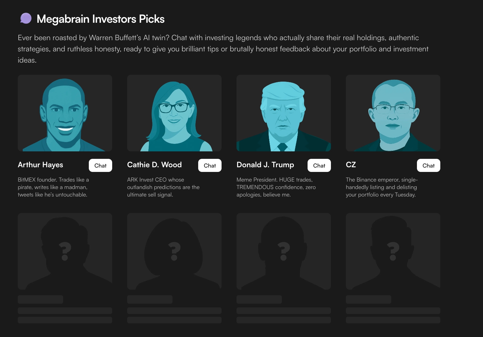 Megabrain lets you “chat” with AI versions of well-known investors and market personalities. Each persona carries its own style (aggressive, cautious, contrarian, or narrative-driven) and responds in that voice.
