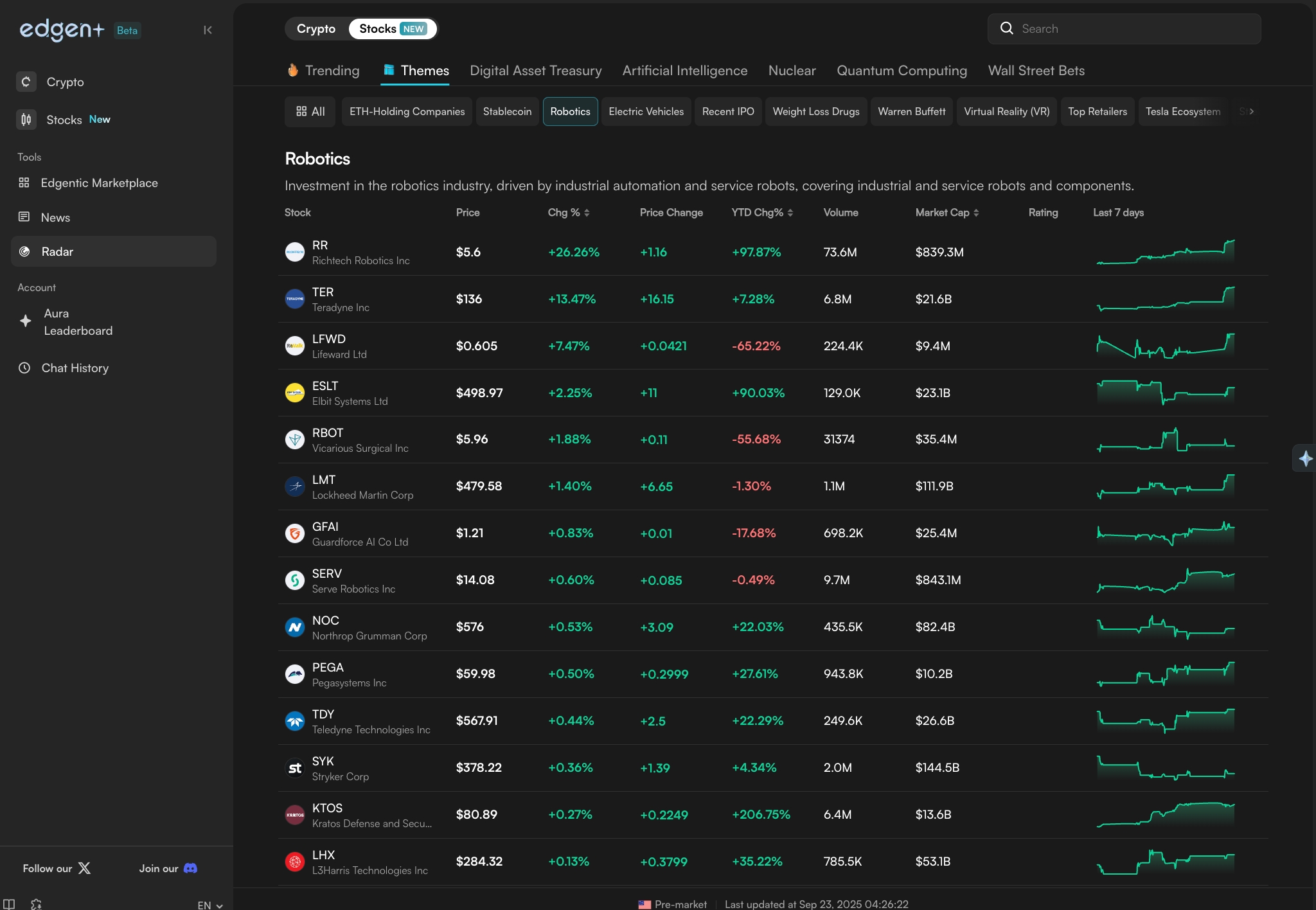 - Themes: tables of assets grouped by sector or narrative, updated like a live index. (previously Radar)