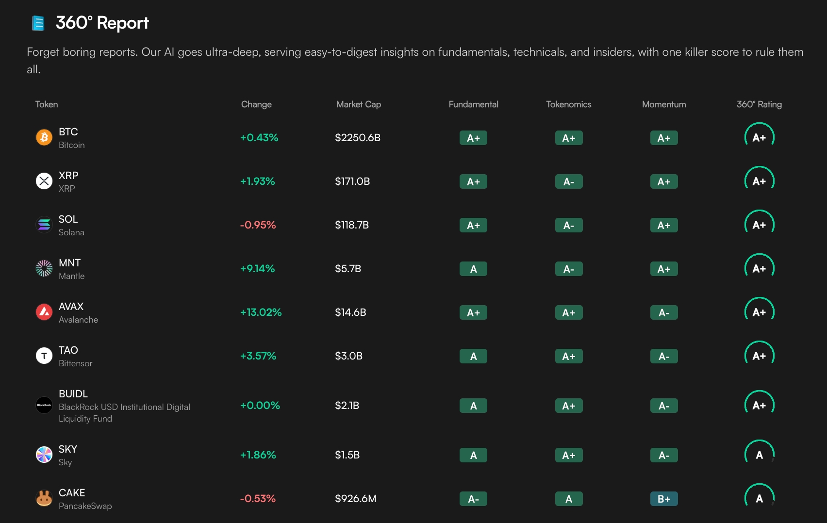 360° Report delivers deep analysis on any stock or token, structured into one clear output. Each report produces a single overall rating, supported by sub-scores across fundamentals, tokenomics, and momentum.