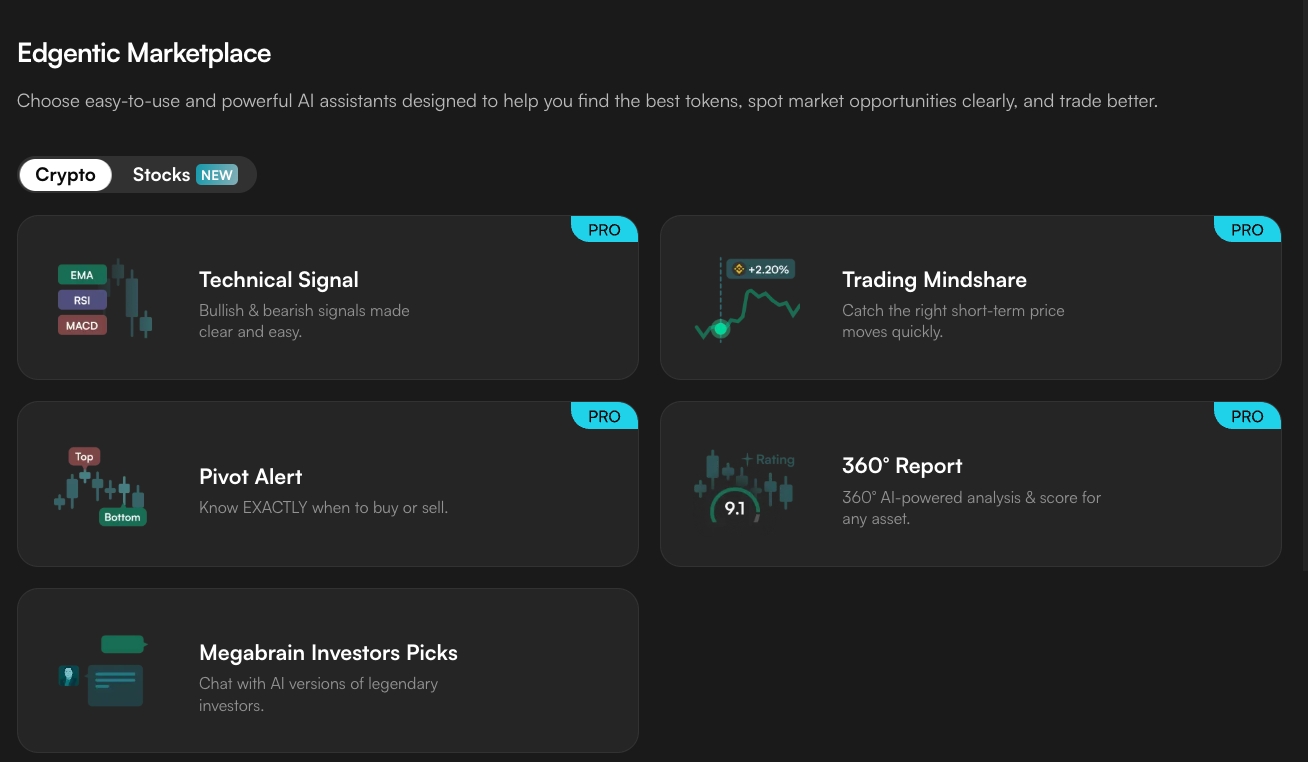 Each agent provides a distinct view of the market: fast technical checks, deeper reports, pivot detection, or narrative simulation. Users activate them on demand and combine outputs to fit their workflow. A short-term trader might pull a Technical Signal and Pivot Alert together. A portfolio analyst might chain a 360° Report with Trading Mindshare.