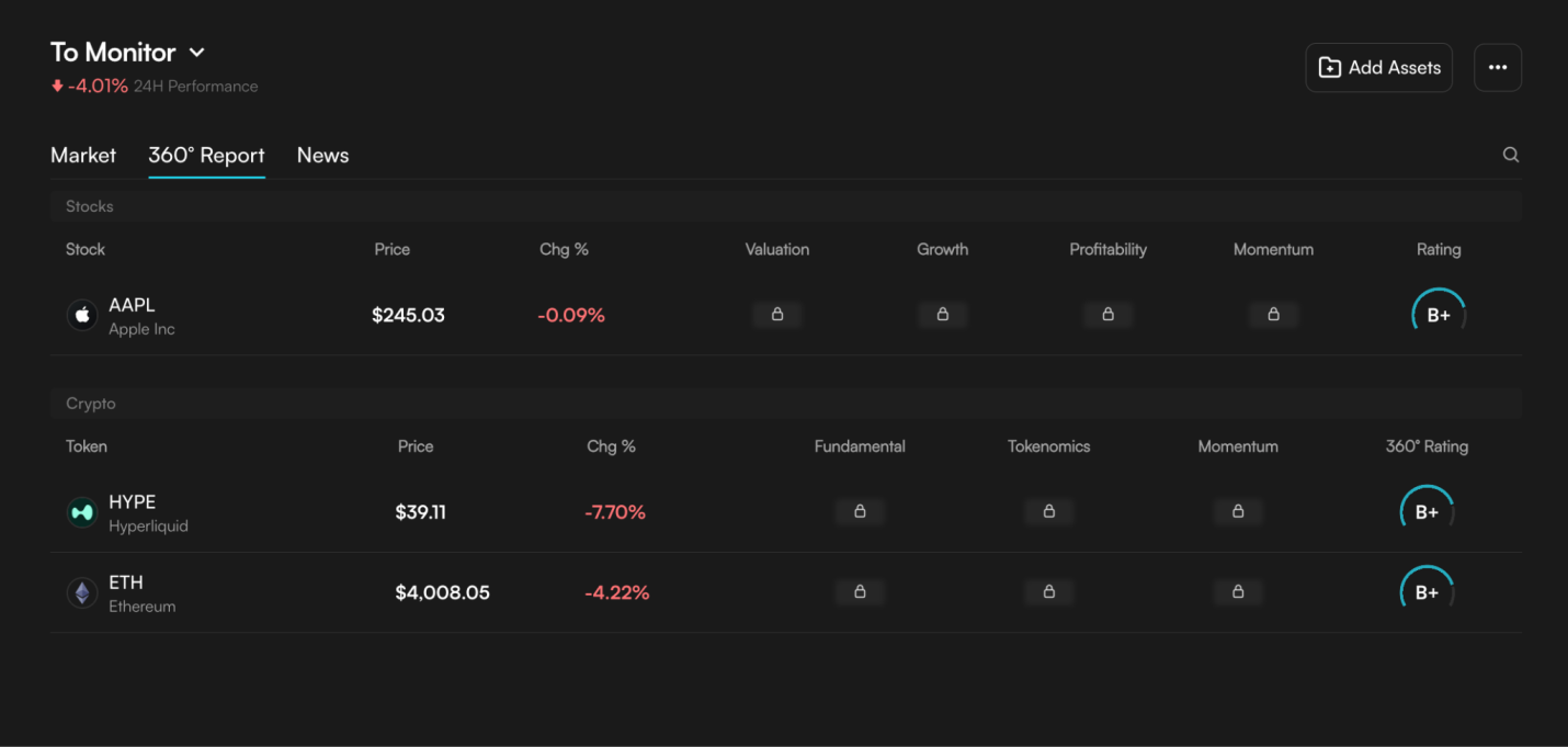 The result is a unified, explainable view that covers every asset you follow, across both stocks and crypto, and updates automatically as conditions shift.