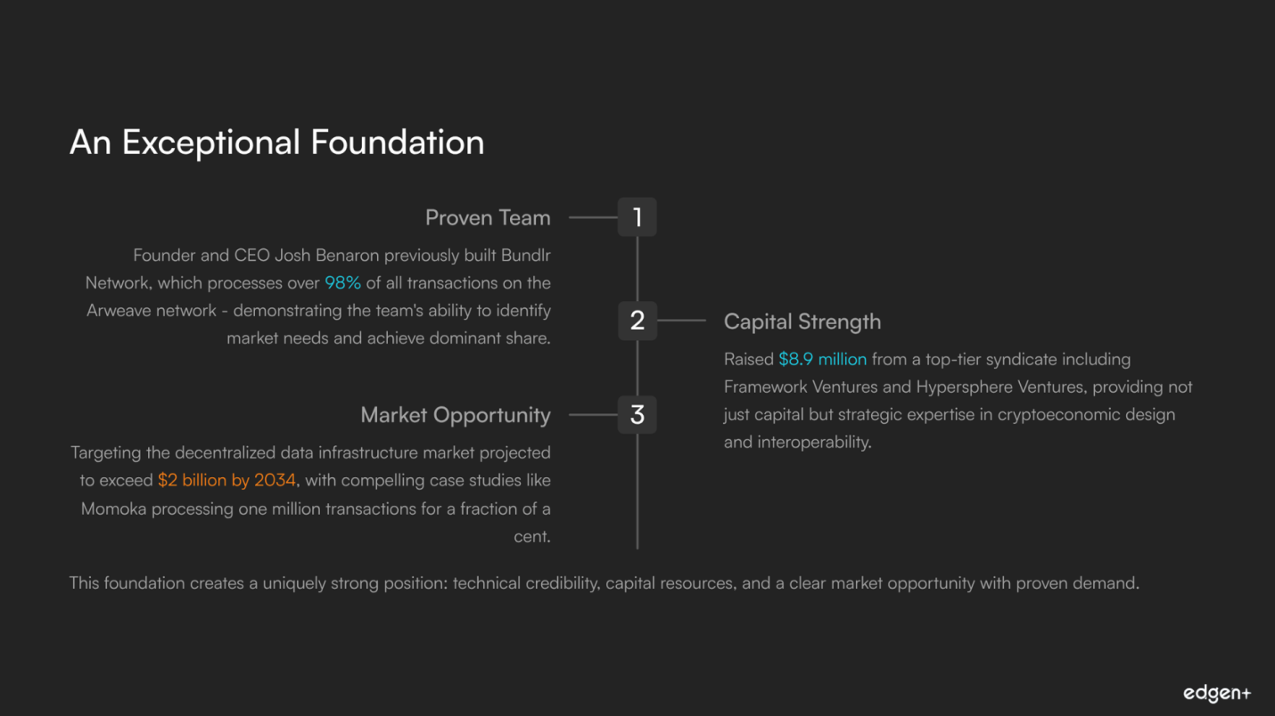 - Irys is built on the exceptional, proven execution of a team that has already achieved dominance in the decentralized data sector.