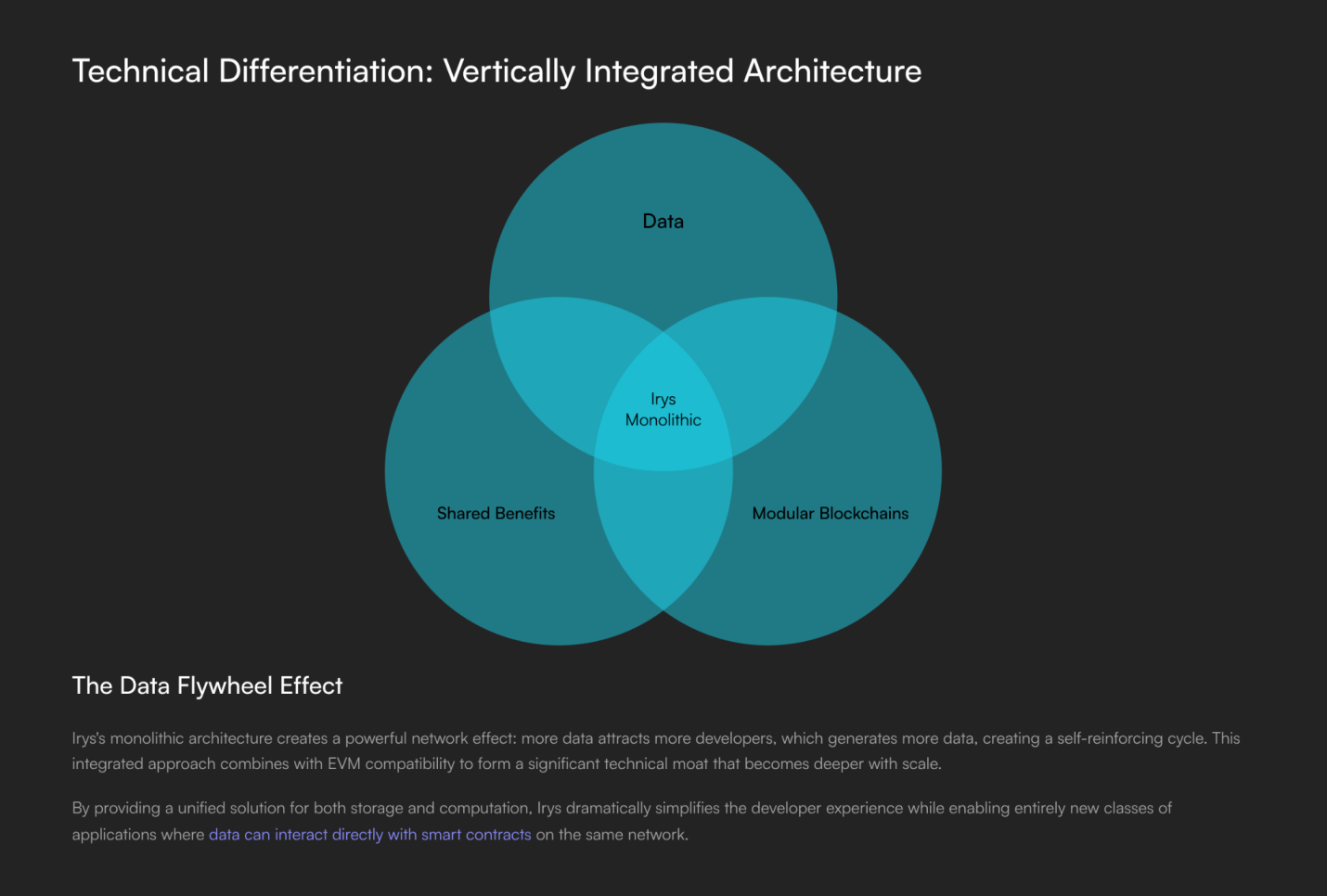 Irys's primary technical differentiator is its monolithic, vertically integrated architecture, which stands in stark contrast to the modular approach of competitors. By fusing a storage layer with an EVM-compatible execution layer, Irys aims to create a "data flywheel" where more data attracts more developers, creating a compounding network effect. This integrated approach, combined with EVM compatibility, forms the basis of its potential long-term moat.