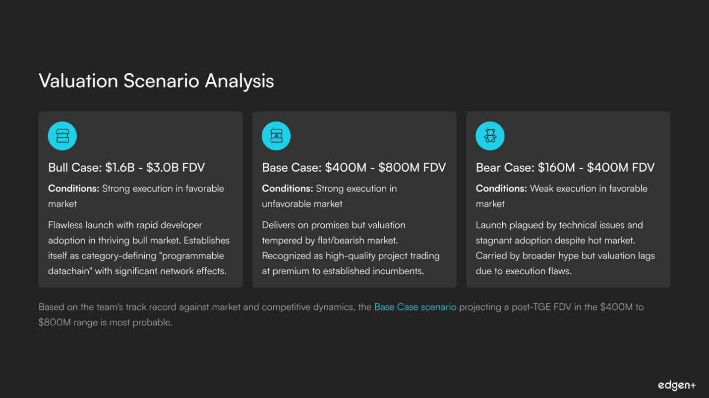 Programmable Datachain (L1) | $0.4B - $0.8B | Irys's projected Base Case post-TGE FDV, emphasizing strong execution despite potentially challenging market conditions. | |