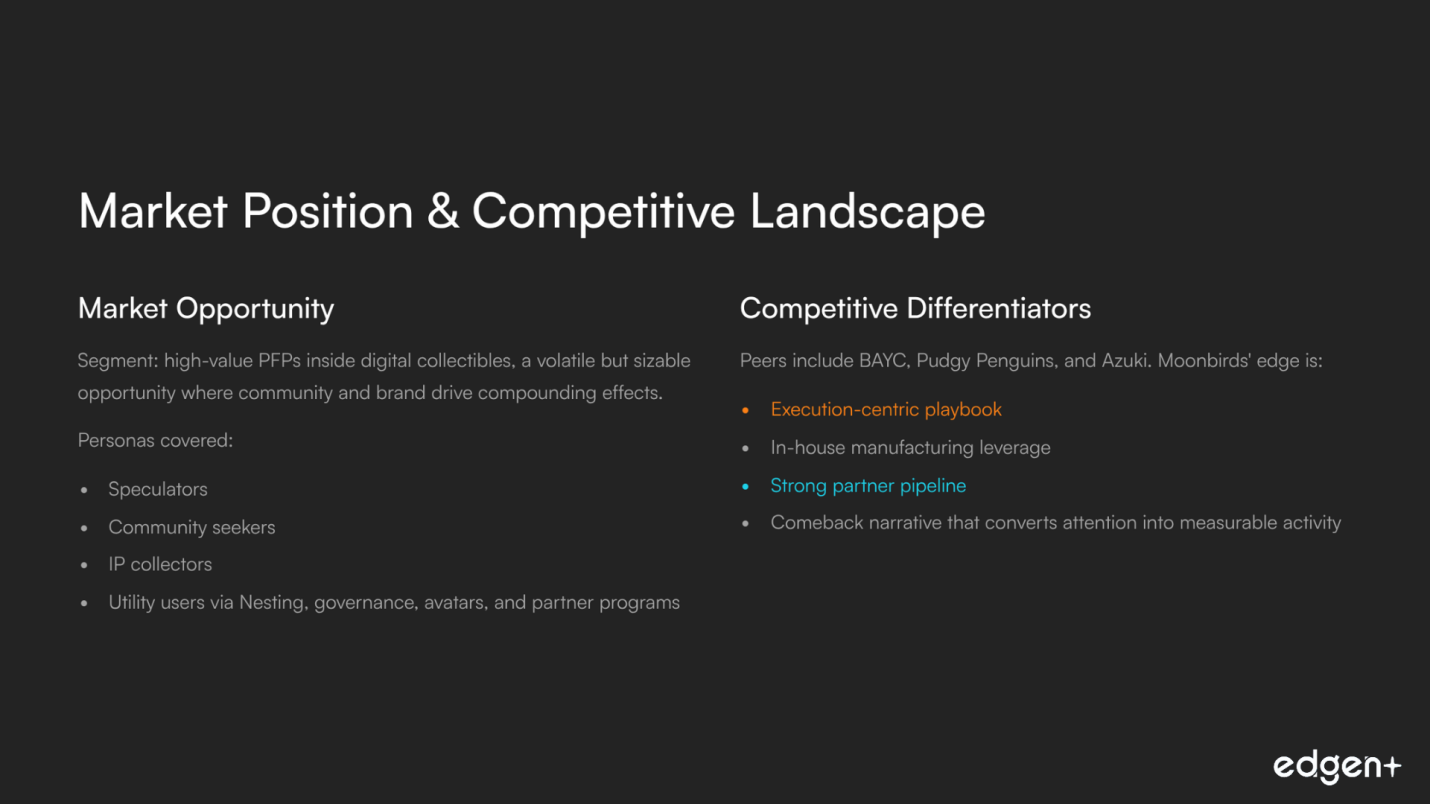 Peers include BAYC, Pudgy Penguins, and Azuki. Moonbirds’ edge is an execution-centric playbook, in-house manufacturing leverage, a strong partner pipeline, and a comeback narrative that converts attention into measurable activity.