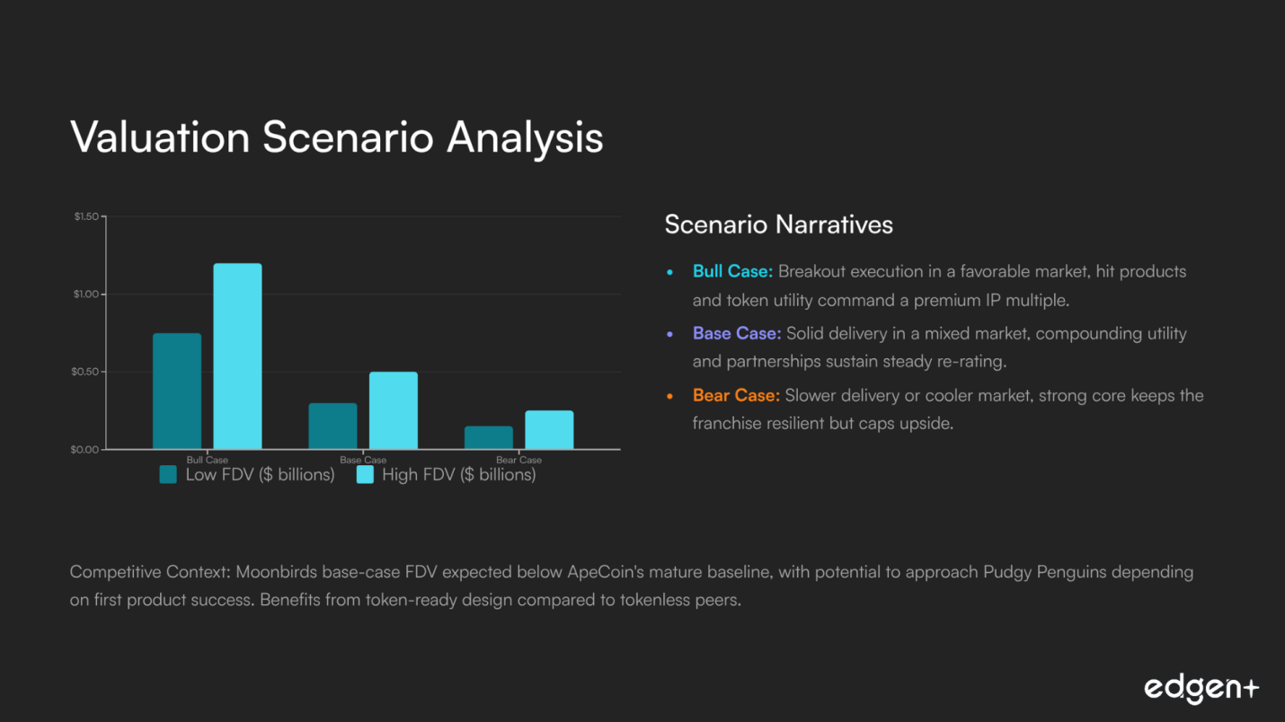 Pudgy Penguins | IP, toys, and gaming flywheel | Penguin holders | Community-aligned | Moonbirds base-case FDV near or below PENGU, contingent on first product success. | |