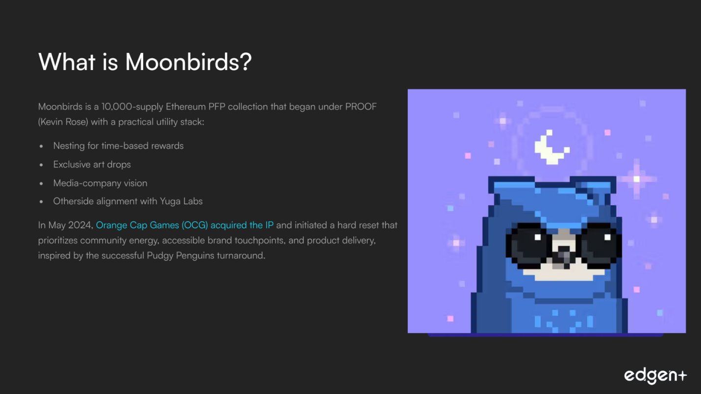 Moonbirds is a 10,000-supply Ethereum PFP collection that began under PROOF (Kevin Rose) with a practical utility stack: Nesting for time-based rewards, exclusive art drops, and a media-company vision. It later aligned with Yuga Labs for Otherside. In May 2025, Orange Cap Games (OCG) acquired the IP and initiated a hard reset that prioritizes community energy, accessible brand touchpoints, and product delivery, inspired by the successful Pudgy Penguins turnaround.