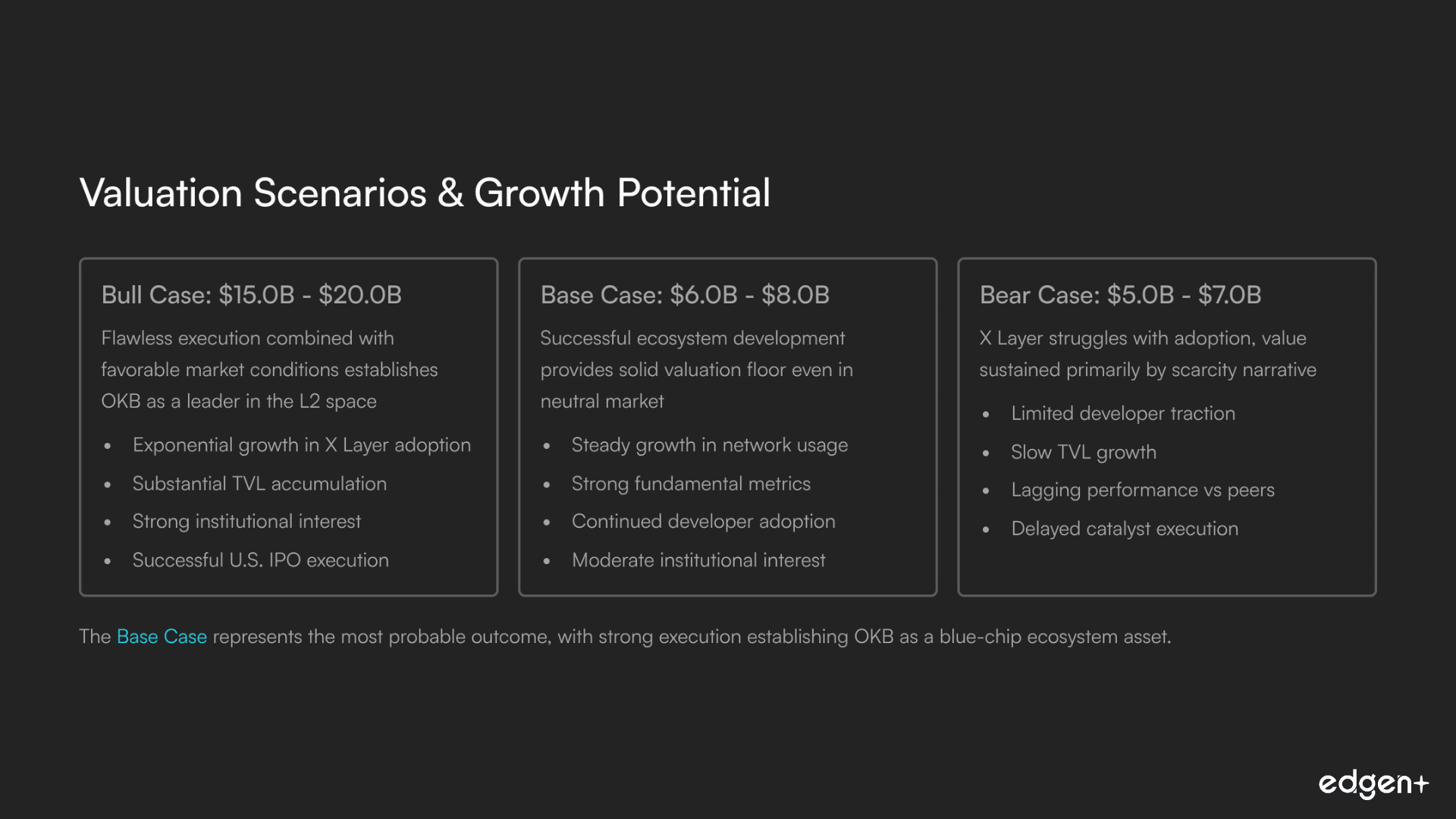 Bull Case | ≈ US$15.0 B – $20.0 B | Flawless execution and a favorable bull market combine to establish OKB as a leader in the L2 space, achieving substantial user and TVL growth. |
