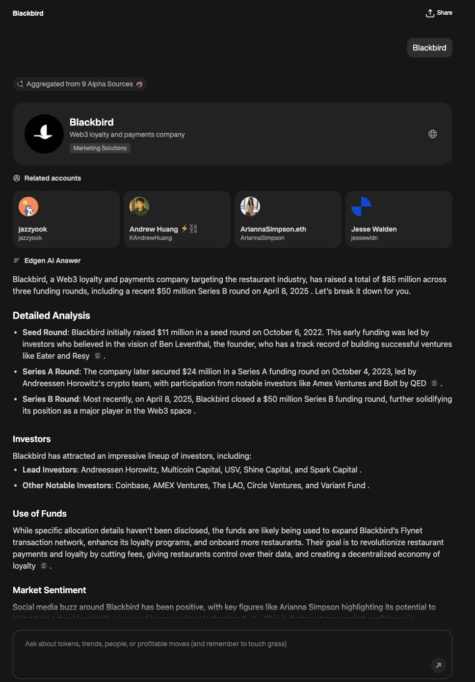 だから我々はまず2つのシンプルで強力なツールから始めます。膨大な時間をかけて蓄積・精査を重ねた独自のソーシャルおよびマーケットデータのおかげで、エッジンの目的に合わせて設計されたAIは、ブルーチップトークンの調査であれ、新規トークンの分析であれ、鋭いインサイトを提供する点において他を凌駕しています。メモコインズ、影響力のある市場参加者、または最新の資金調達取引。