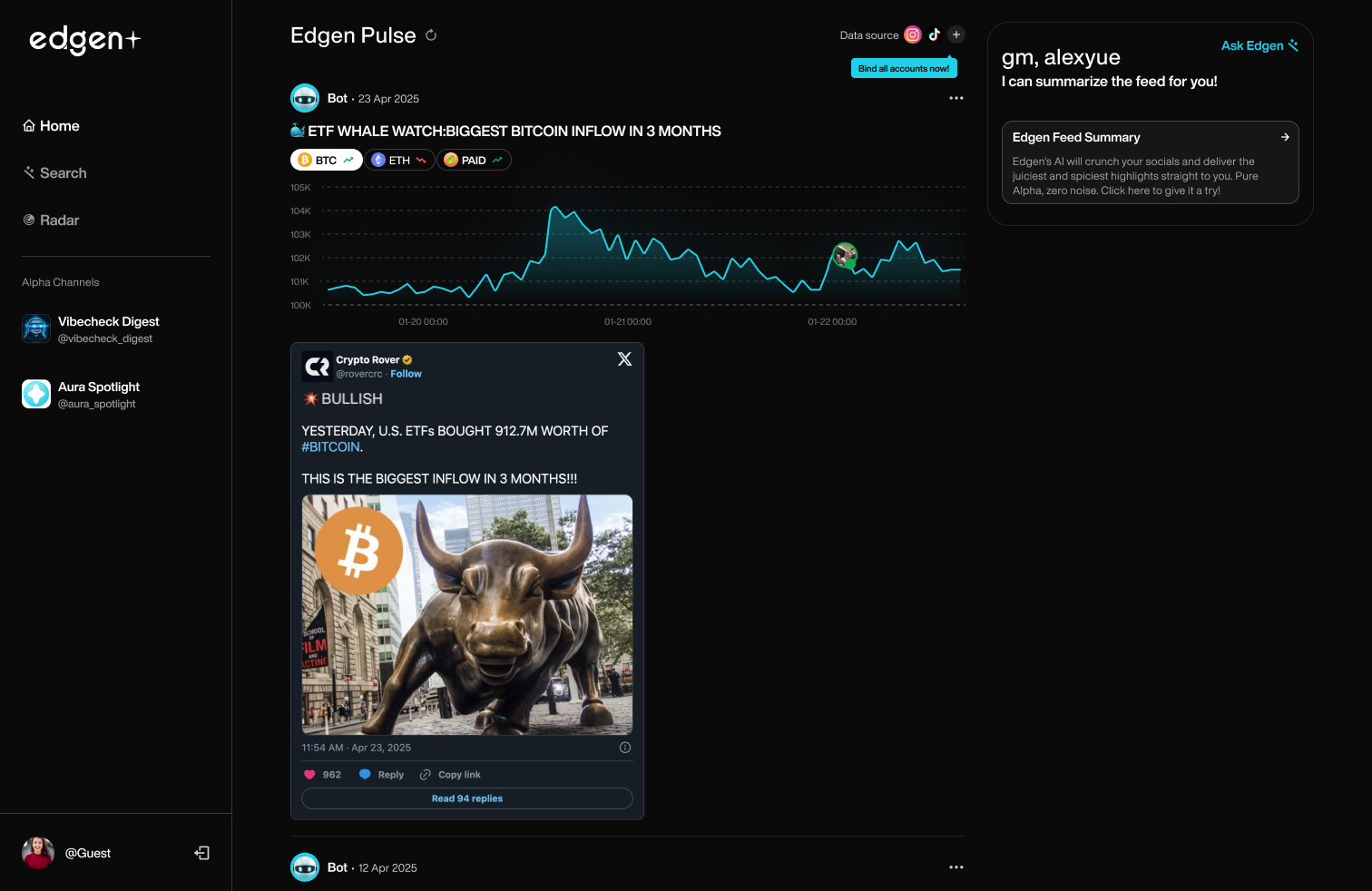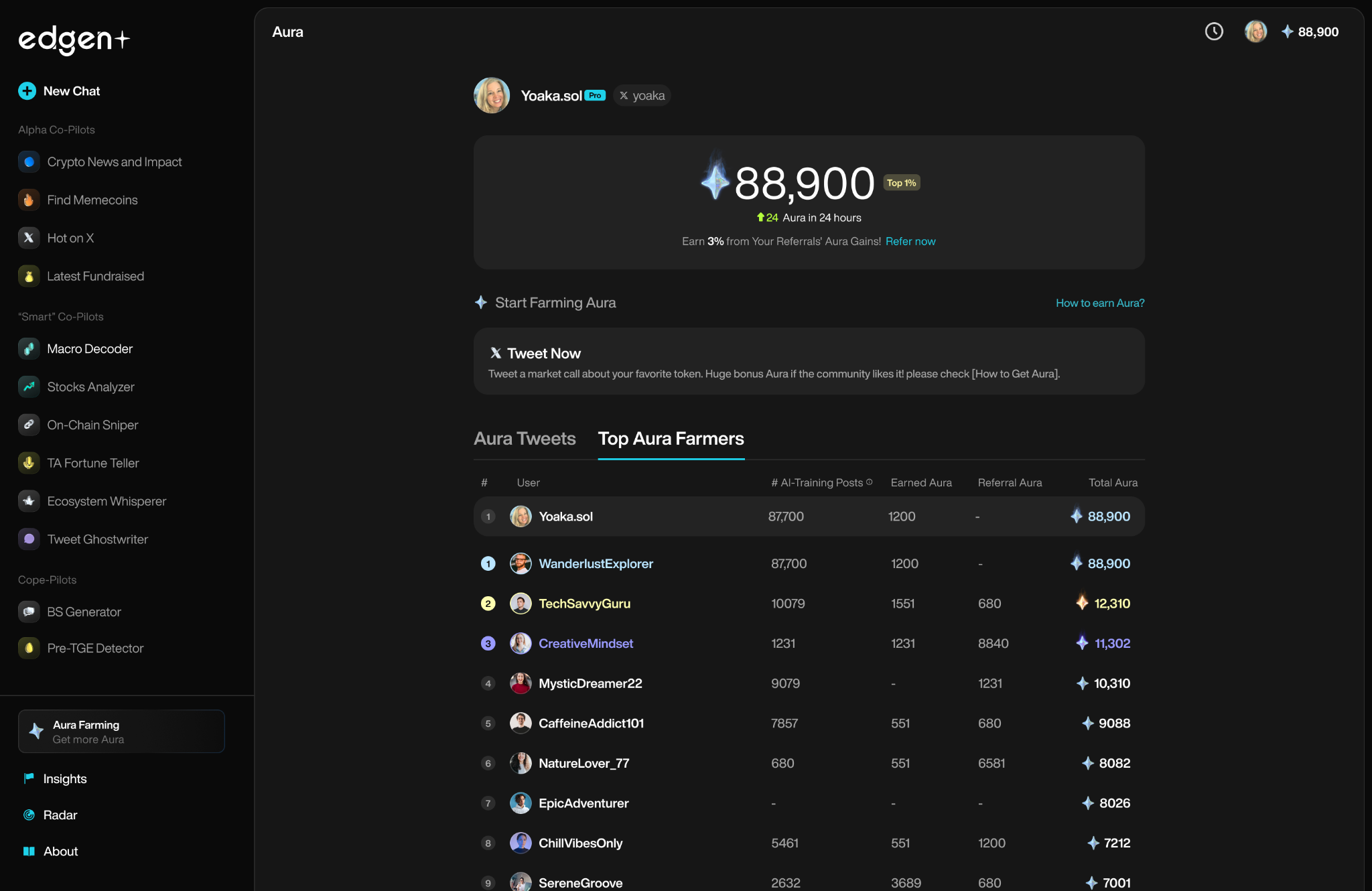 Chia sẻ suy nghĩ của bạn công khai trên Twitter. Nếu phân tích của bạn trở nên phổ biến trong vòng 24 giờ, bạn sẽ nhận được điểm Aura. Edgen thưởng cho bạn khi bạn chia sẻ suy nghĩ có tác động trong cộng đồng tiền mã hóa rộng lớn một cách hiệu quả.Edgen’s AIsẽ xem xét xem đóng góp của bạn có liên quan đến tiền mã hóa và chứa một $cashtag, trong vòng 24 giờ để đủ điều kiện nhận Aura.